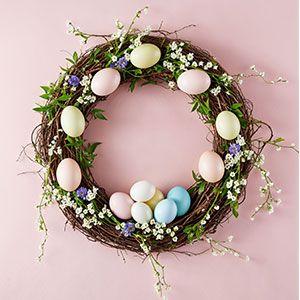 Junte com um prato raso um objeto que projete altura para ele e ovos de galinha ou de plástico e palha. Você pode pintá-los, desviá-los ou deixar com a cor natural. Coloque os ovos em cima do prato de uma maneira que o centro fique livre e centralize a palha. Finalize com um laço e pronto!